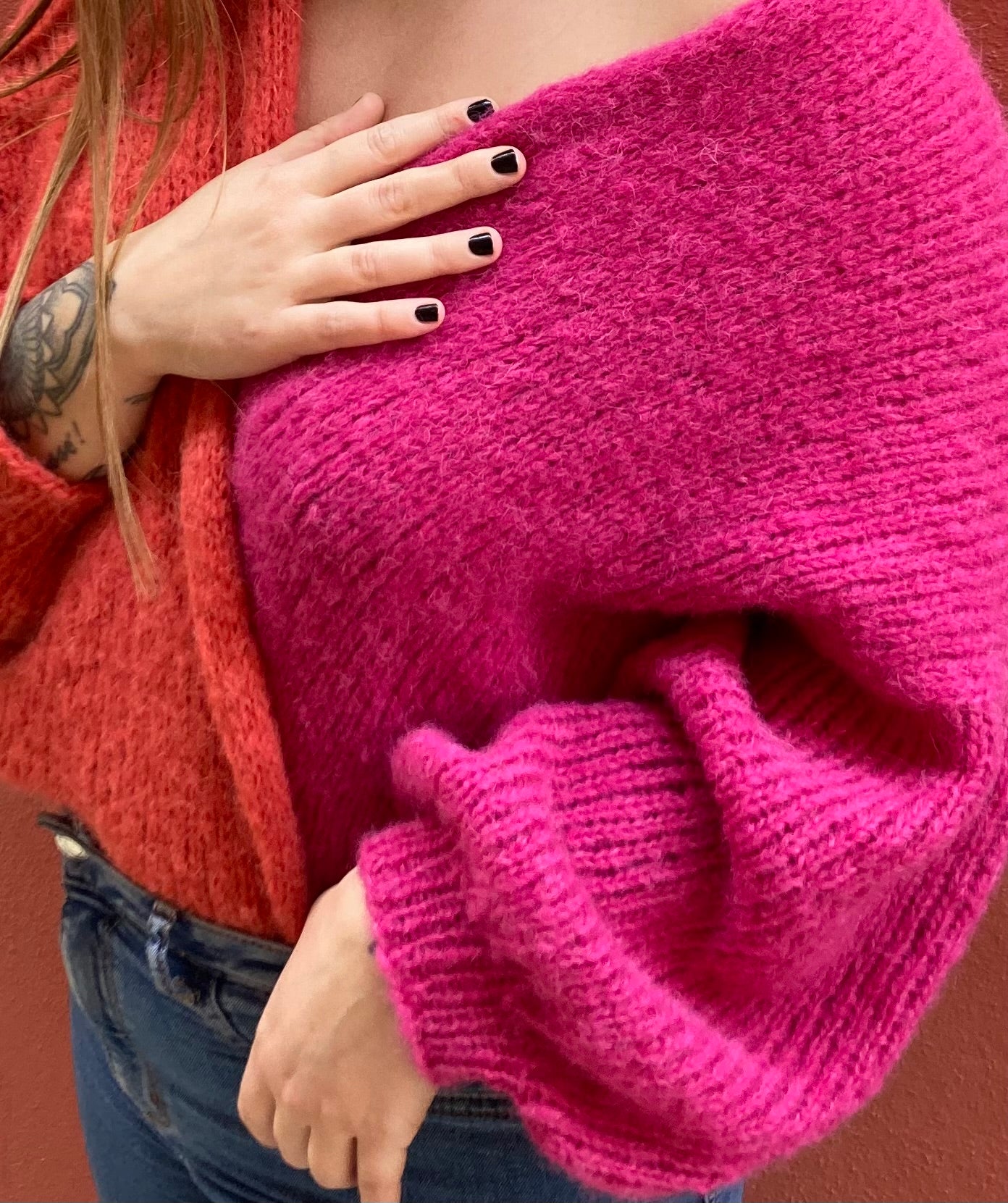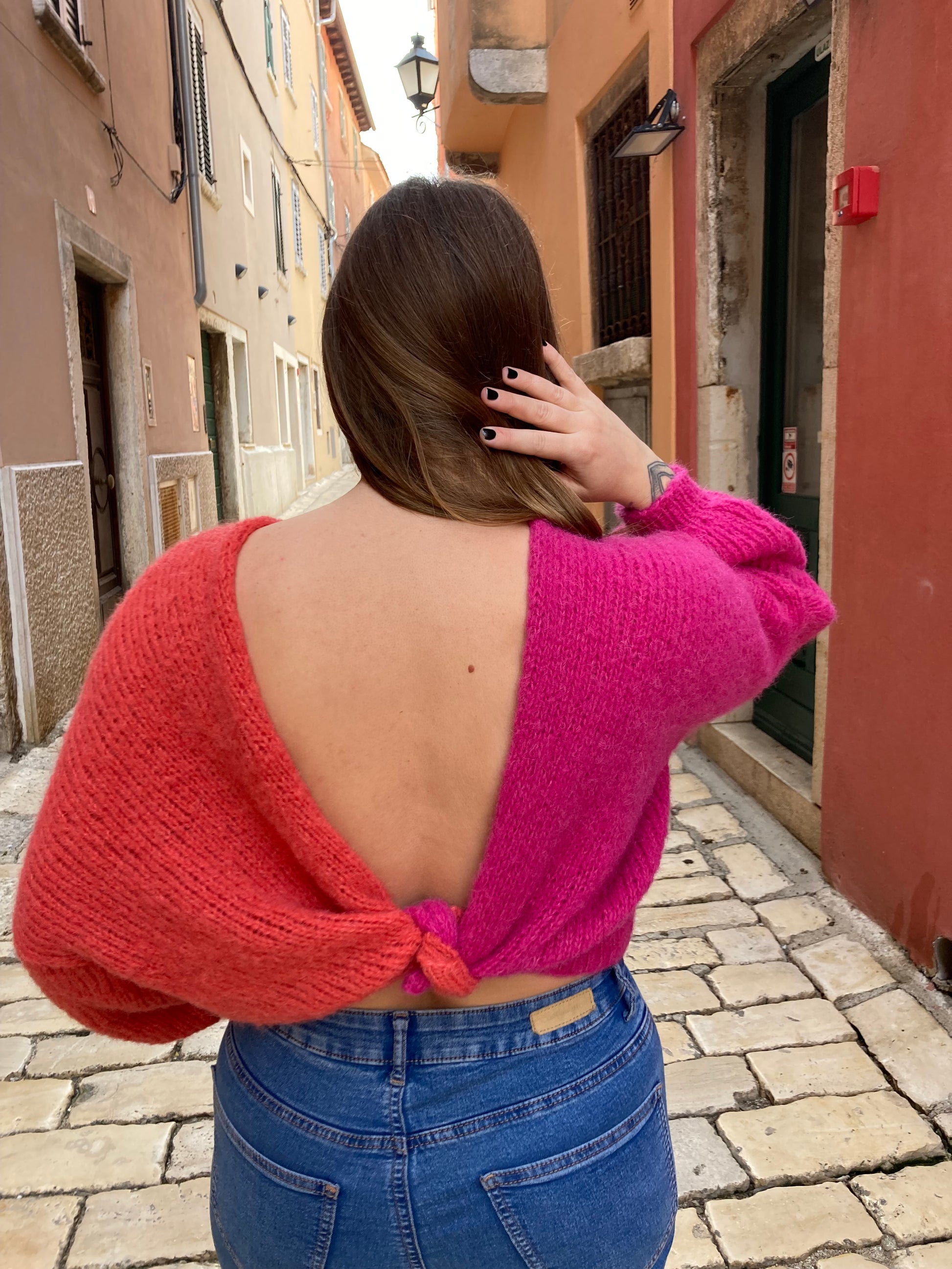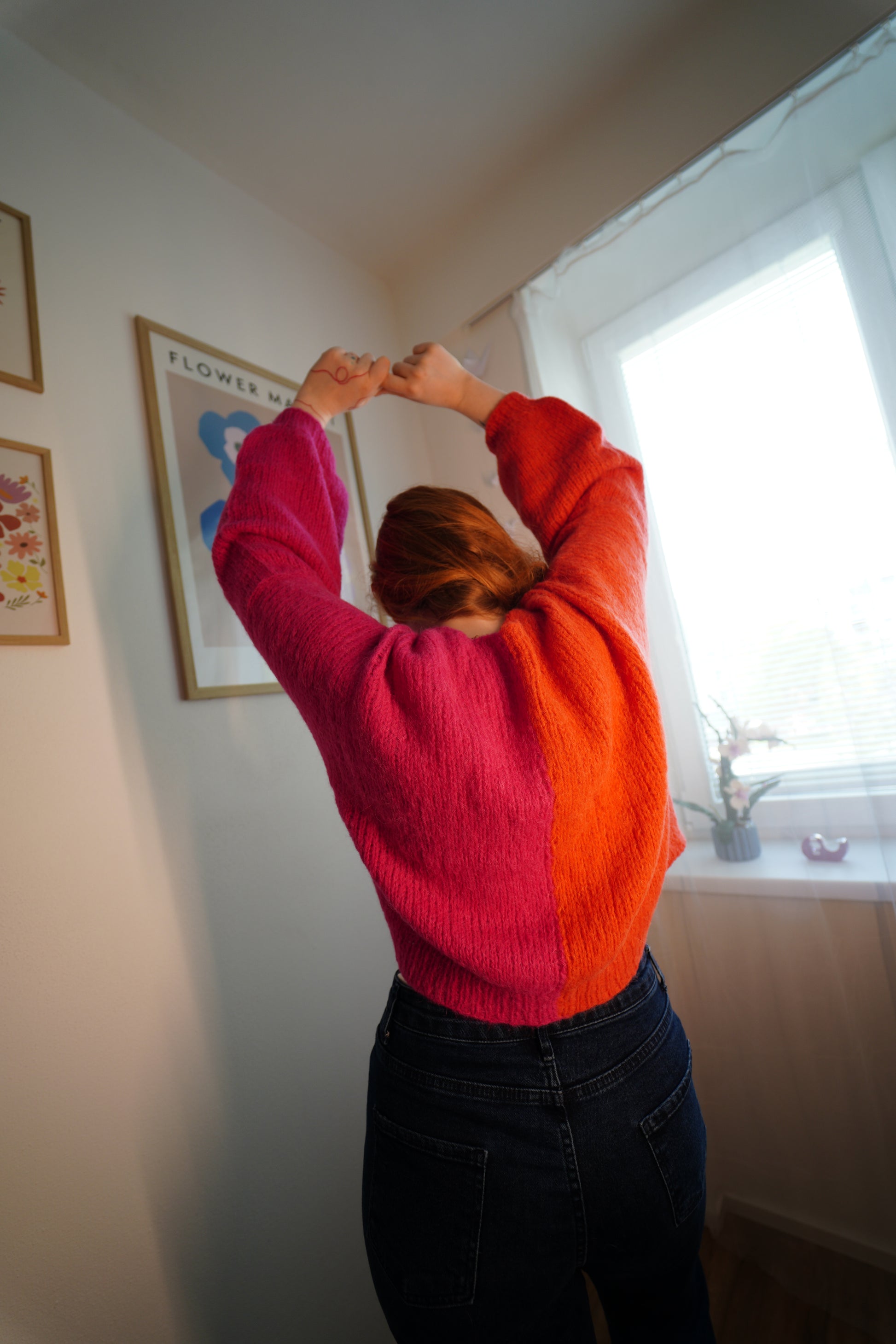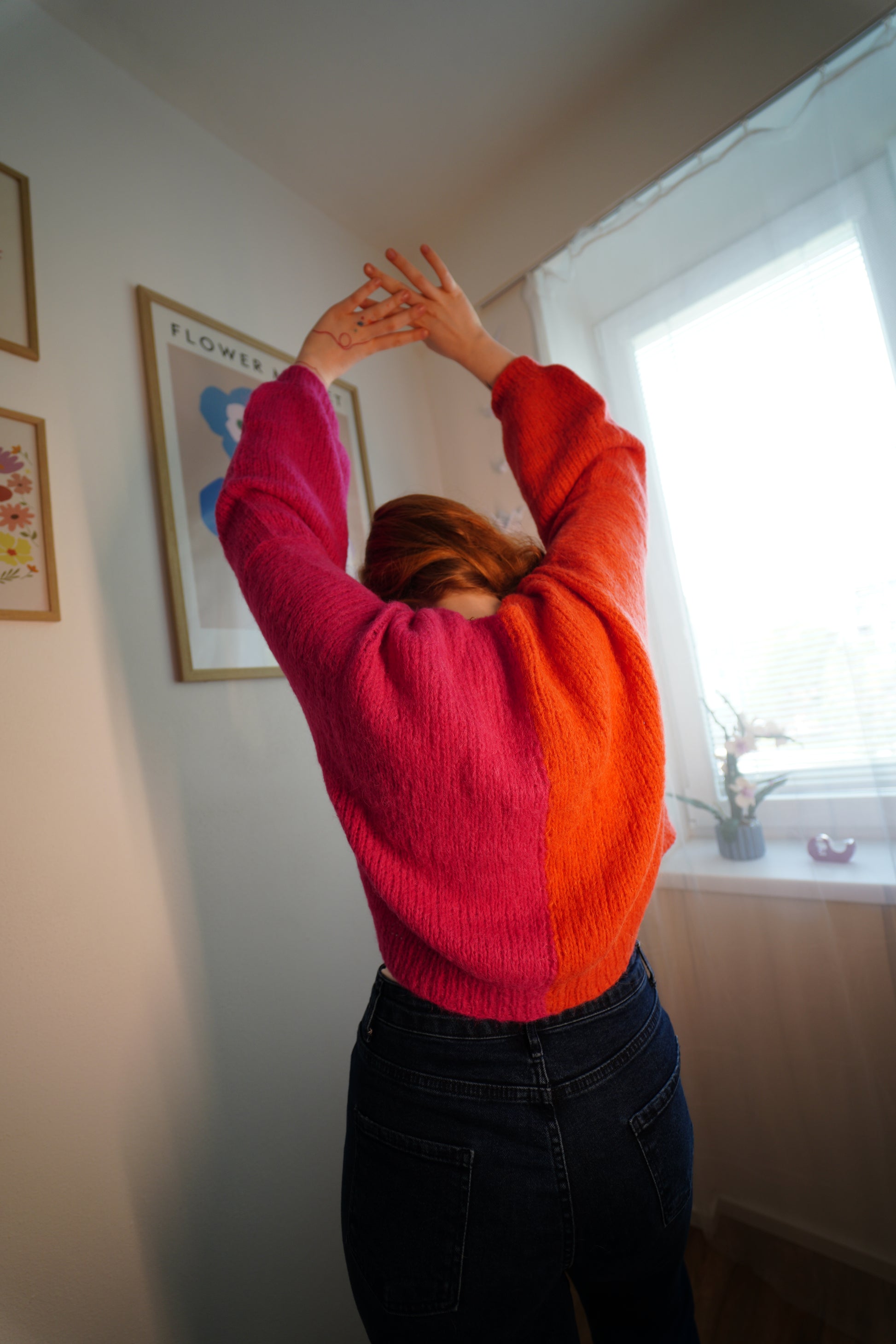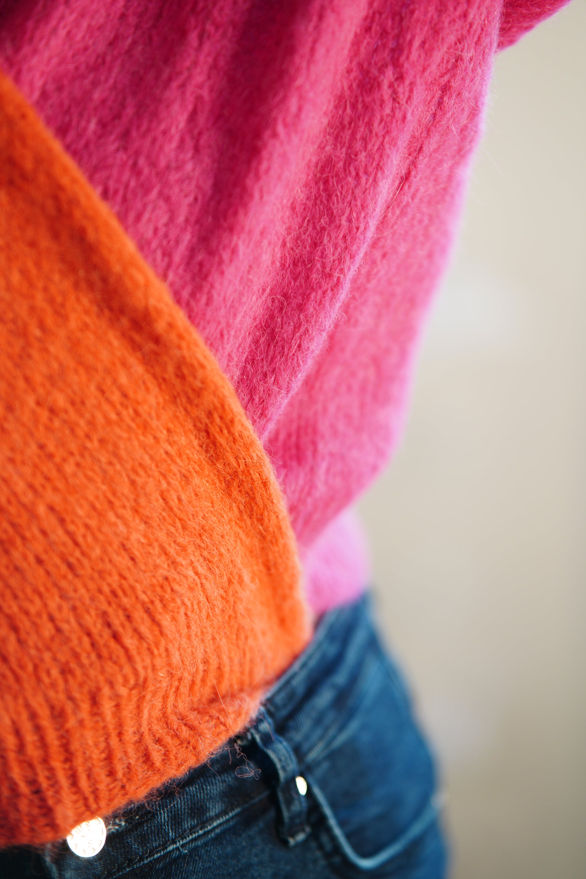 Oranžovo fuksiový svetr z vysokokvalitní a etické příze z alpaky a hedvábí.