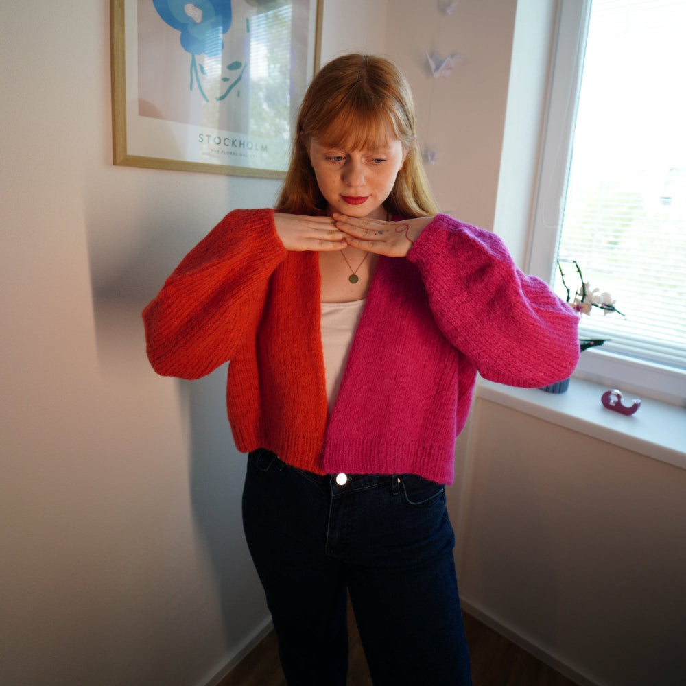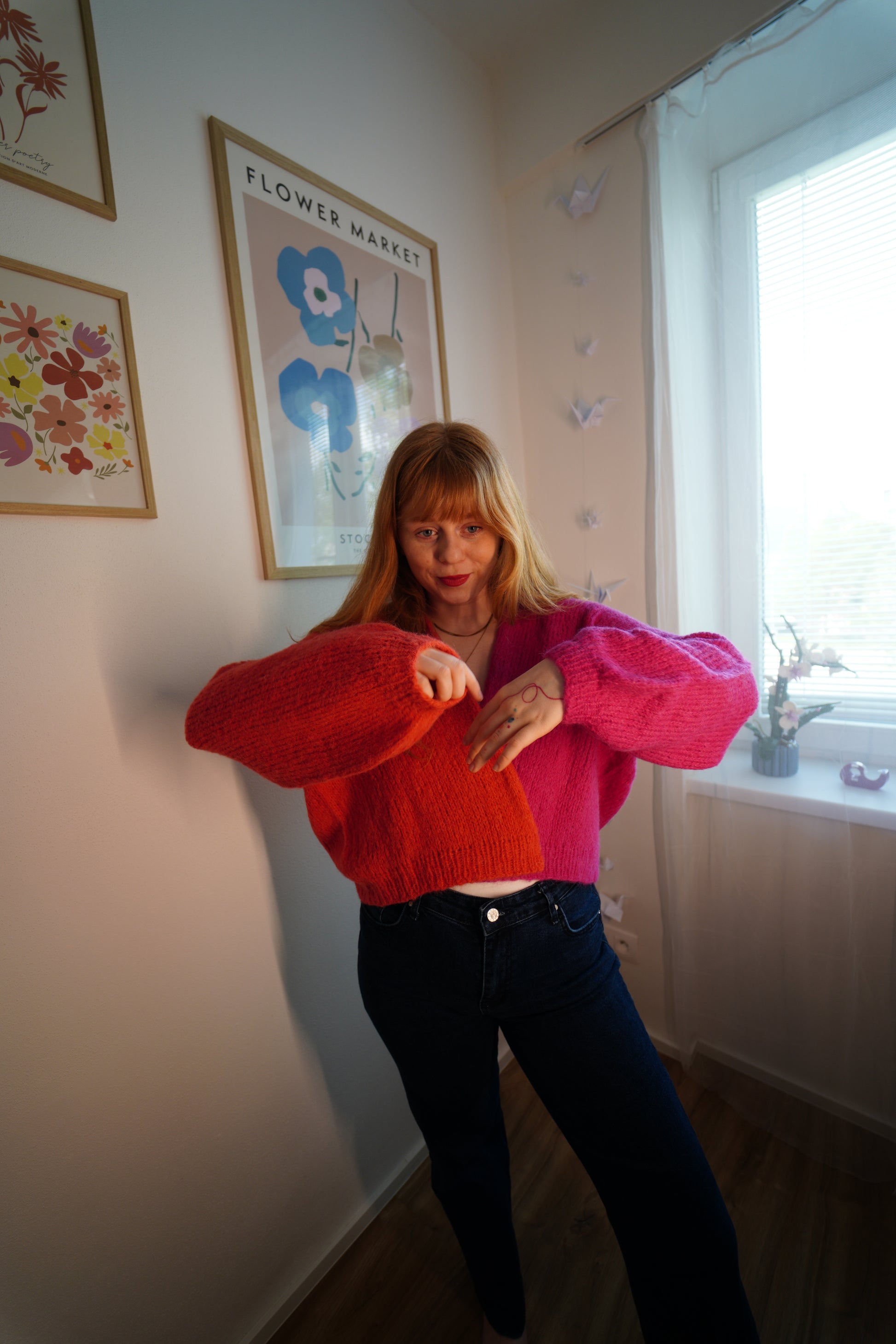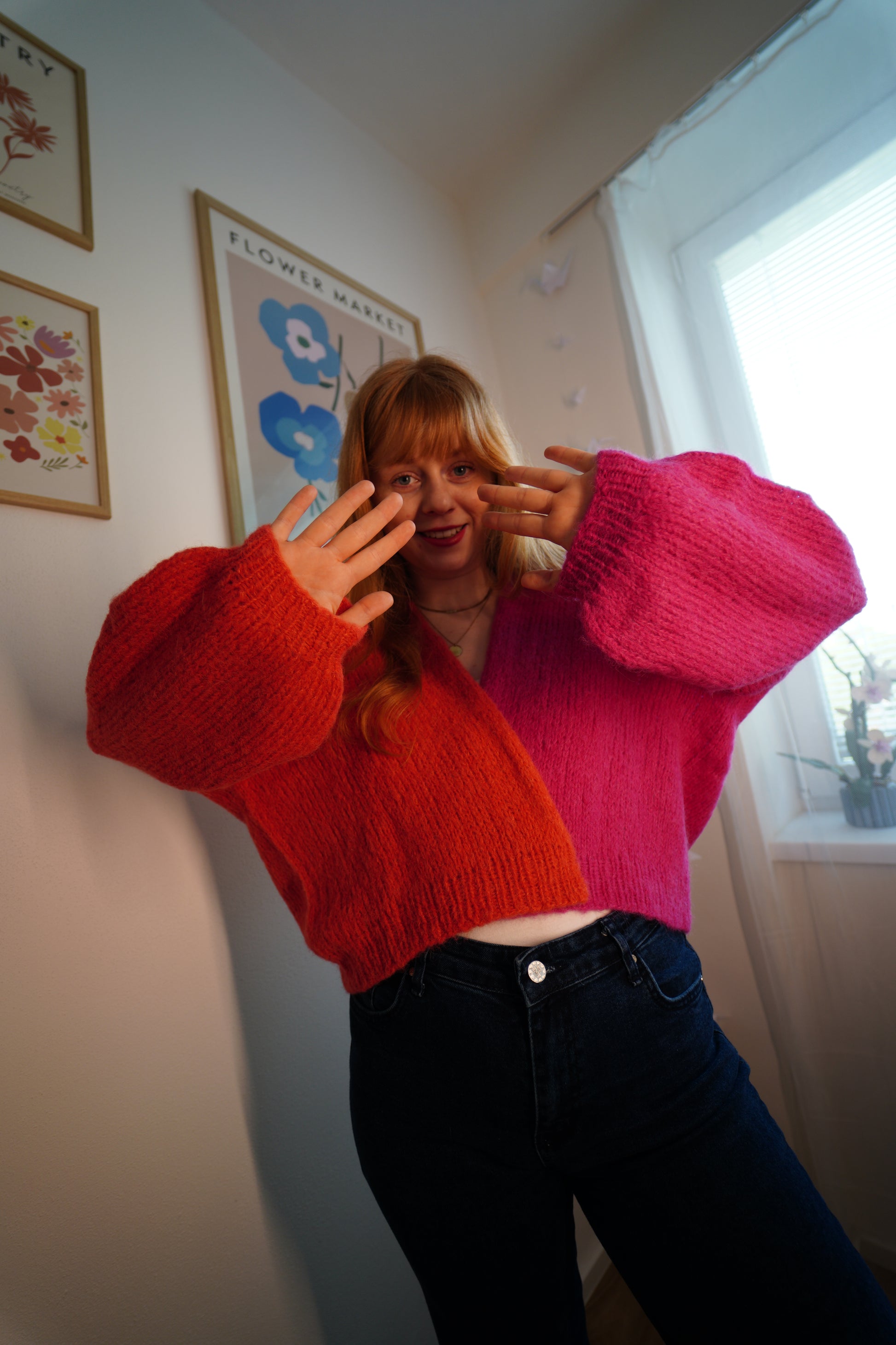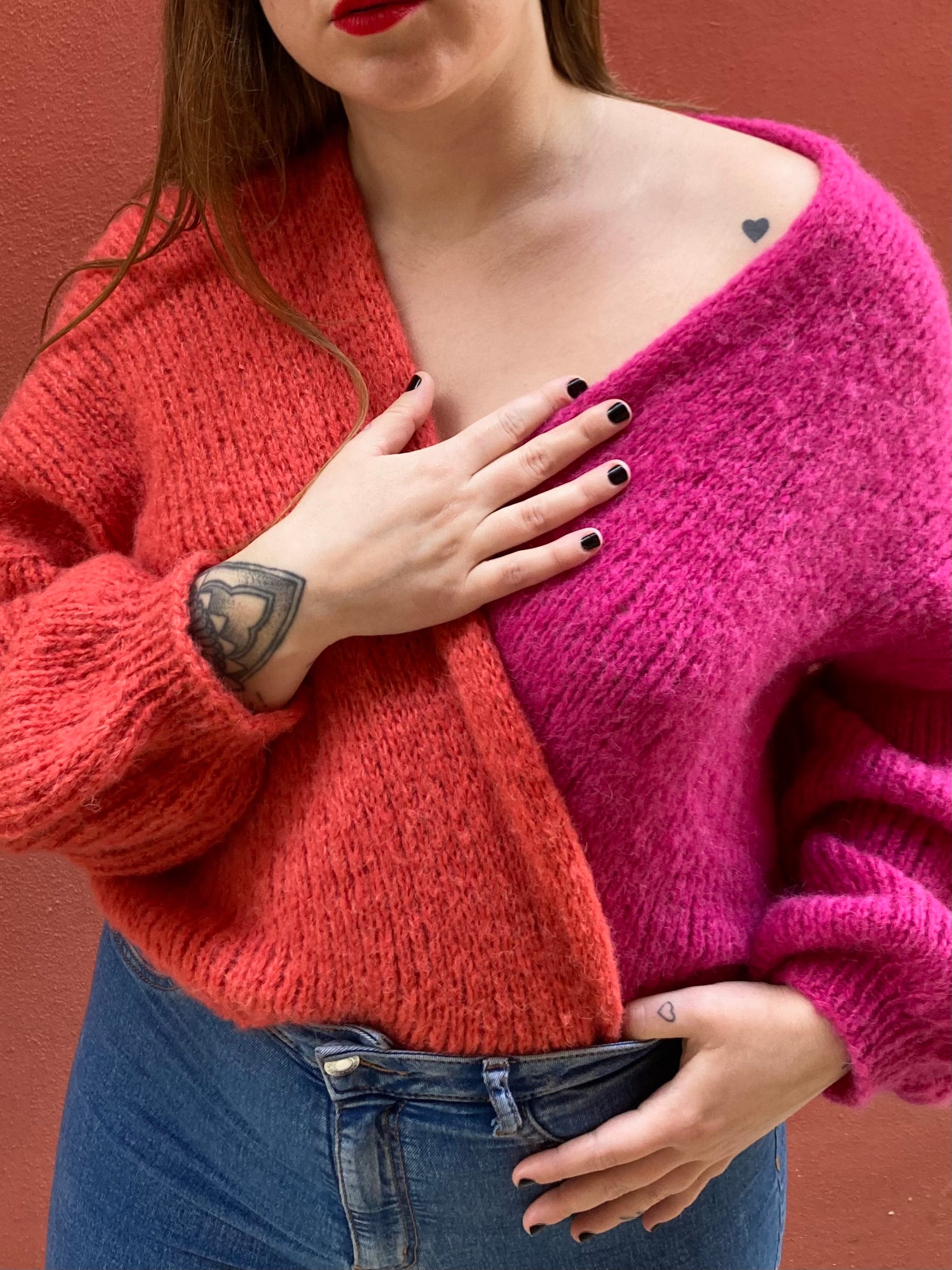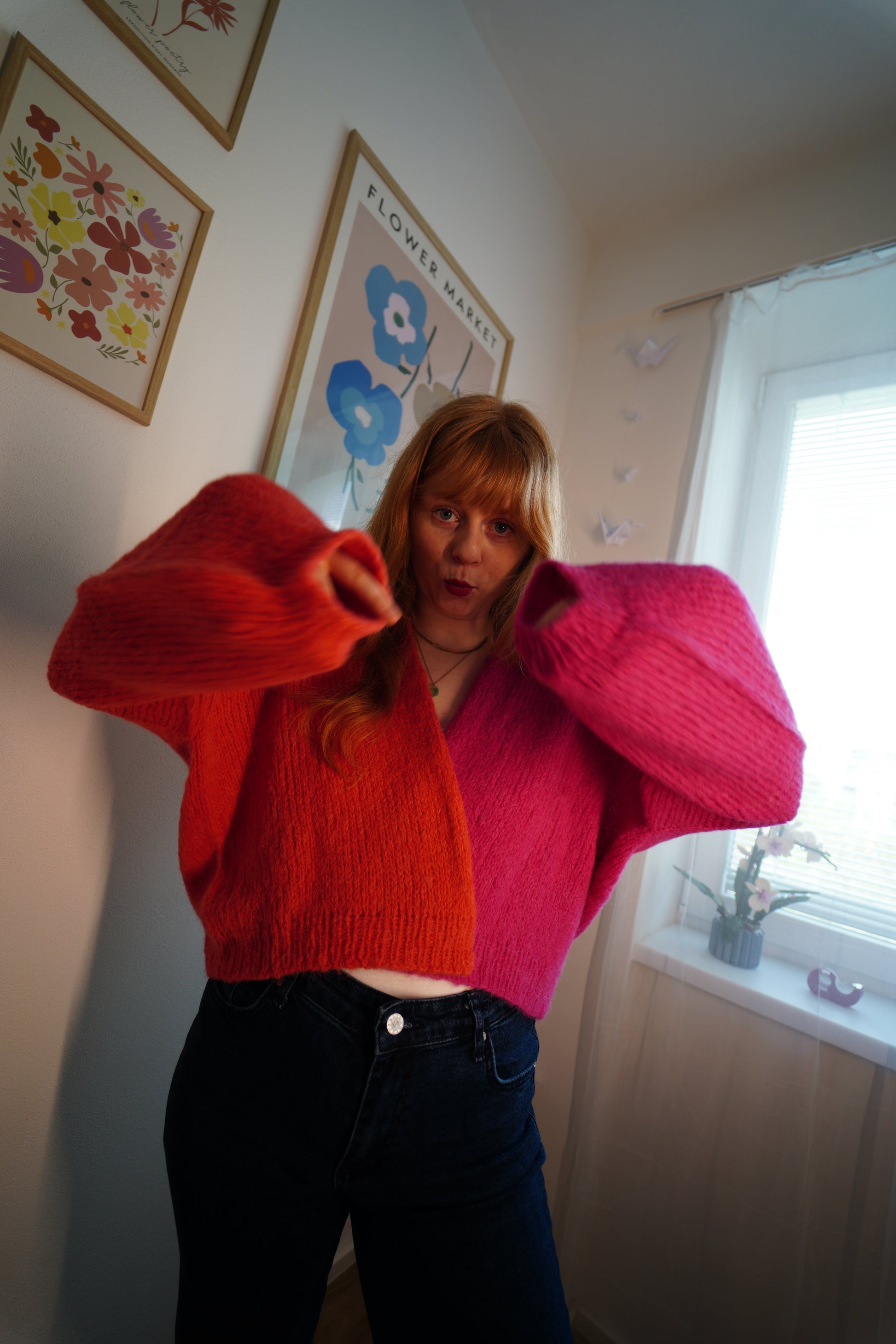 Oranžovo fuksiový svetr z vysokokvalitní a etické příze z alpaky a hedvábí.